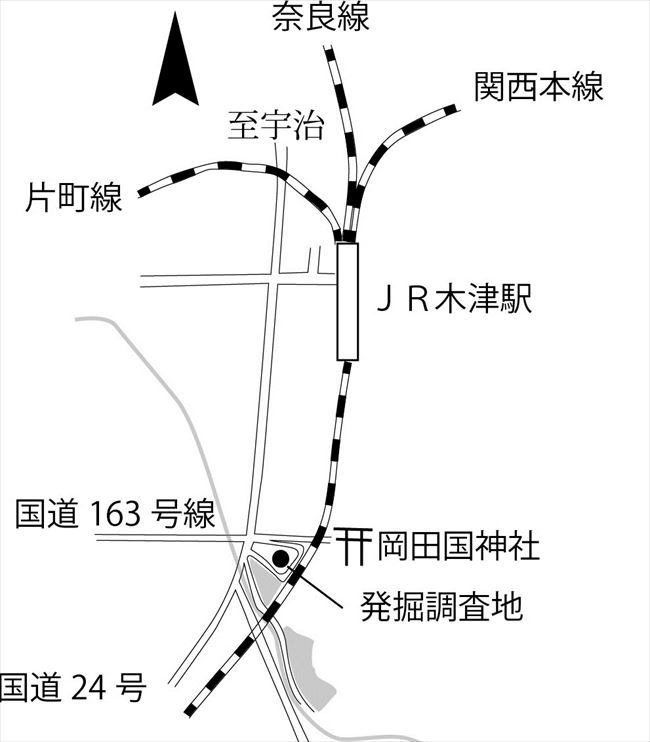 岡田国遺跡(京都府木津川市木津馬場南地内の発掘調査地)(下図参照) |