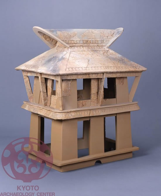 大山崎ジャンクション建設に伴う下植野南(しもうえのみなみ)遺跡の発掘調査で見つかった土辺古墳から出土した高さ約1mの大型の家形埴輪で、屋根や建物の各部に立体的な文様が精巧に表現されています。もとは全面が赤く彩色され、軒先に下がる垂幕や軒を支える方杖(ほうづえ)などは、この埴輪の復原作業で初めて構造が明らかになりました。高床か二階建ての祭殿を模したものと思われ、古墳時代前期の家形埴輪の全容を知る貴重な資料として、平成16年度に京都府指定文化財(考古資料)となっています。