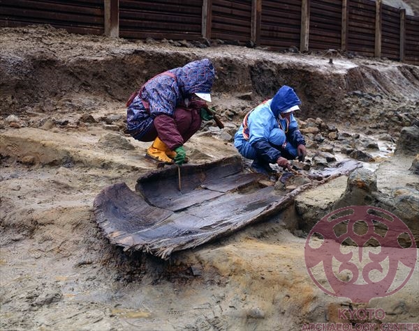 この丸木舟は、日本海に面した半島の先端に形成された砂嘴(さし)で、海砂に埋没した状態で出土しました。推定全長7m以上、幅1m以上で、船底板の厚さは7cmでした。直径1m以上、長さ8m前後の杉の巨木を半分に割り、石斧を使って刳り貫いたものです。船体の内側には焼け焦げた痕跡が残っており、焼いた石を置いて木材を焦がしながら刳り貫いたと思われます。丸木舟は、放射性炭素年代測定法と呼ばれる分析方法により、今からおよそ5,130~5,350年前につくられたことがわかりました。周辺では縄文時代の炉跡や配石遺構がみつかっており、縄文時代中期初頭の遺物が出土しています。北陸地方の土器や山陰地方の黒曜石が出土していることから当時の人々はこの舟を利用して航海し、周辺地域と交流していたのでしょう。